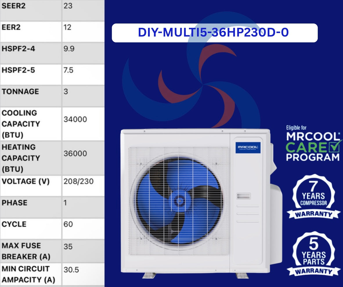 The brand new 5th Generation MRCOOL® DIY® 36k BTU Multi-Zone Ductless Mini-Split Condenser is the right choice if you need immediate, effective comfort that won’t break the bank! This system, which can be installed without the assistance of an HVAC professional, is one of the most efficient and innovative HVAC options on the market. With this condenser, you’ll be able to heat and cool up to 5 different spaces equaling around 1,500 square feet, meaning you can potentially heat and cool an entire home with just one mini-split system! Our DIY® Mini-Splits are able to forgo the evacuation and charging process because our patented Quick Connect® line sets are pre-charged with R-454B refrigerant, a more efficient and eco-friendly refrigerant than R-410A, which we have previously used. These line sets are sold separately. This unit achieves a SEER2 of 23 and an HSPF2-4 of 9.9. These fittings make installation an incredibly safe and simple process, allowing you to save a lot of time and money. There are a variety of features to explore once the system is up and running. One of them is the ability to integrate your system with the SmartHVAC app, allowing you to control your comfort with the touch of a button. You can even go a step further and link your Amazon Alexa or Google home for touchless operation. With the app, you can set each zone’s temperature, set schedules for each unit, monitor your system’s energy usage, and more. There are even more features to explore that will help you customize your comfort to be exactly what you want. We’ve got your back in the unlikely event that your system malfunctions. Your system will come with a 5 year parts warranty and a 7 year compressor warranty, and if you enroll in the MRCOOL® Care Program, you’ll be able to enjoy the Limited Lifetime Replacement warranty! For the best comfort you’ve ever felt and a sense of accomplishment as icing on the cake, choose the MRCOOL® DIY®!